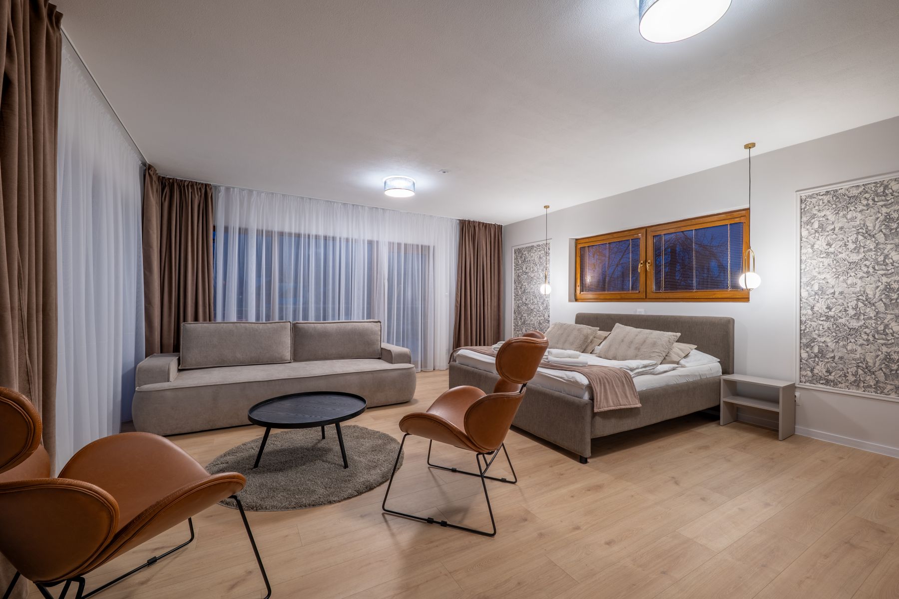 Štýlové, novo zrekonštruované štúdio s kuchyňou a jedálenským kútom, situované na poschodí s južnou orientáciou a výhľadom do záhrady. Otvorený priestor kombinuje spaciu a obývaciu časť, čím vytvára vzdušné a komfortné prostredie.