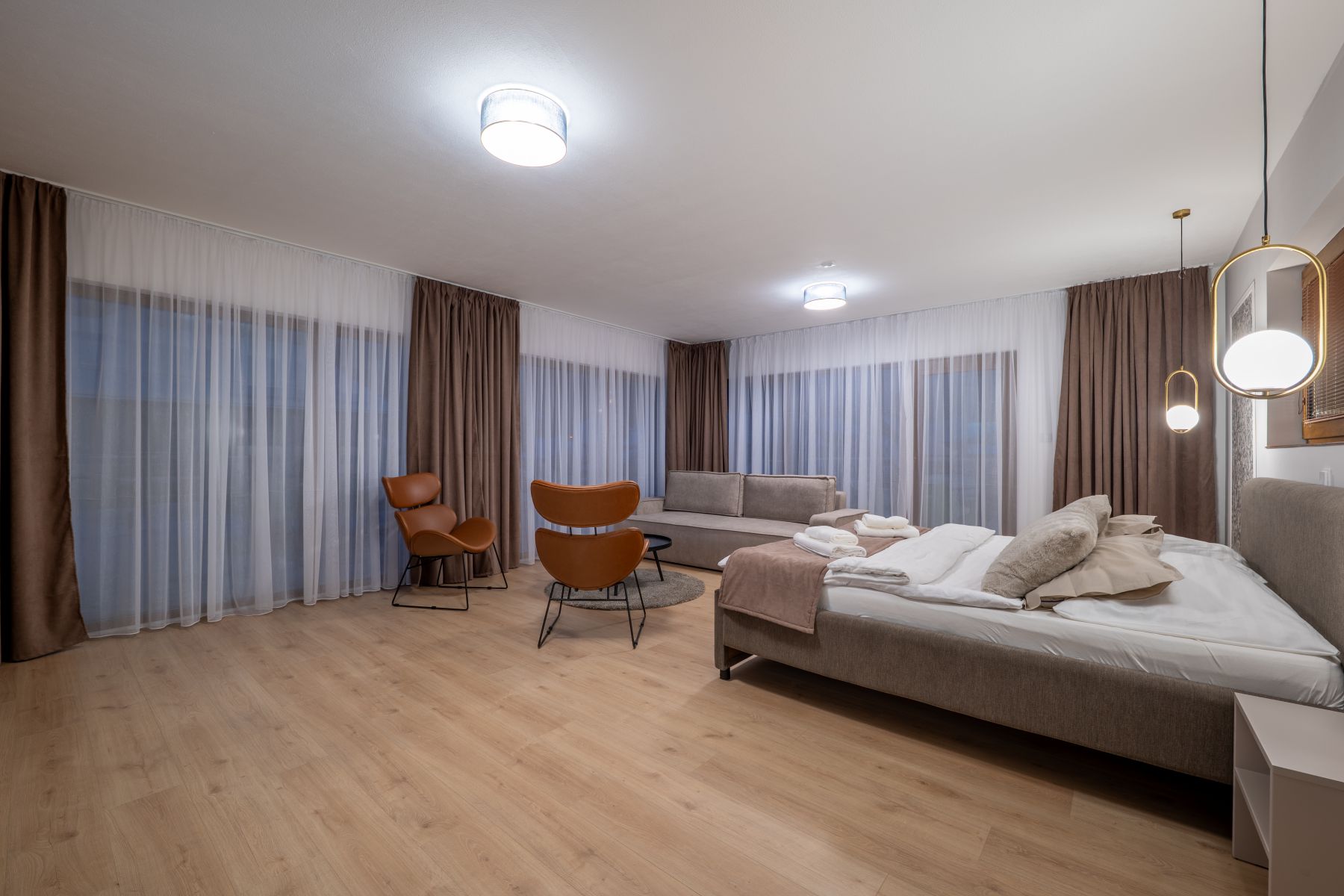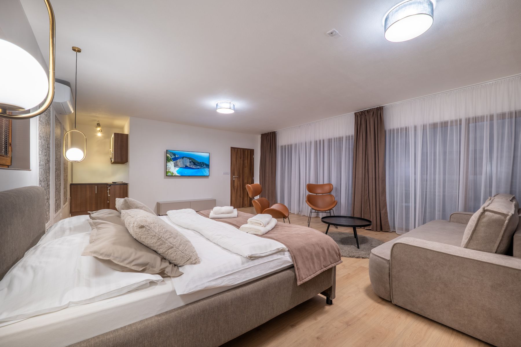Štúdio disponuje manželskou posteľou a rozkladacou pohovkou pre 2 osoby. Súčasťou je aj súkromná terasa so sedením a klimatizácia pre maximálny komfort počas celého roka.