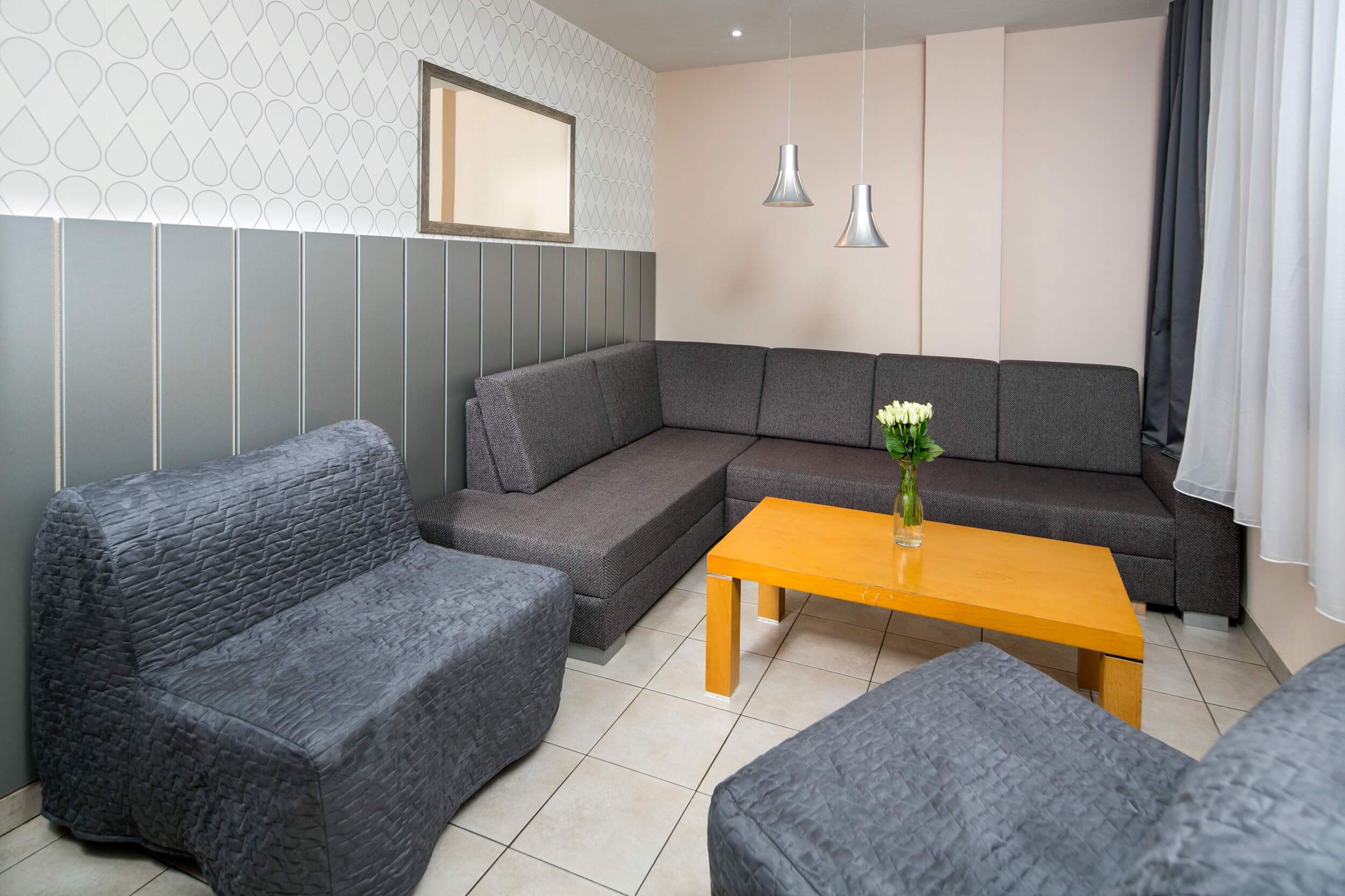 Priestranný apartmán typu deluxe na prízemí s dvoma samostatnými spálňami a súkromnou terasou so sedením. Apartmán ponúka dostatok priestoru a komfortu pre rodiny aj väčšie skupiny.