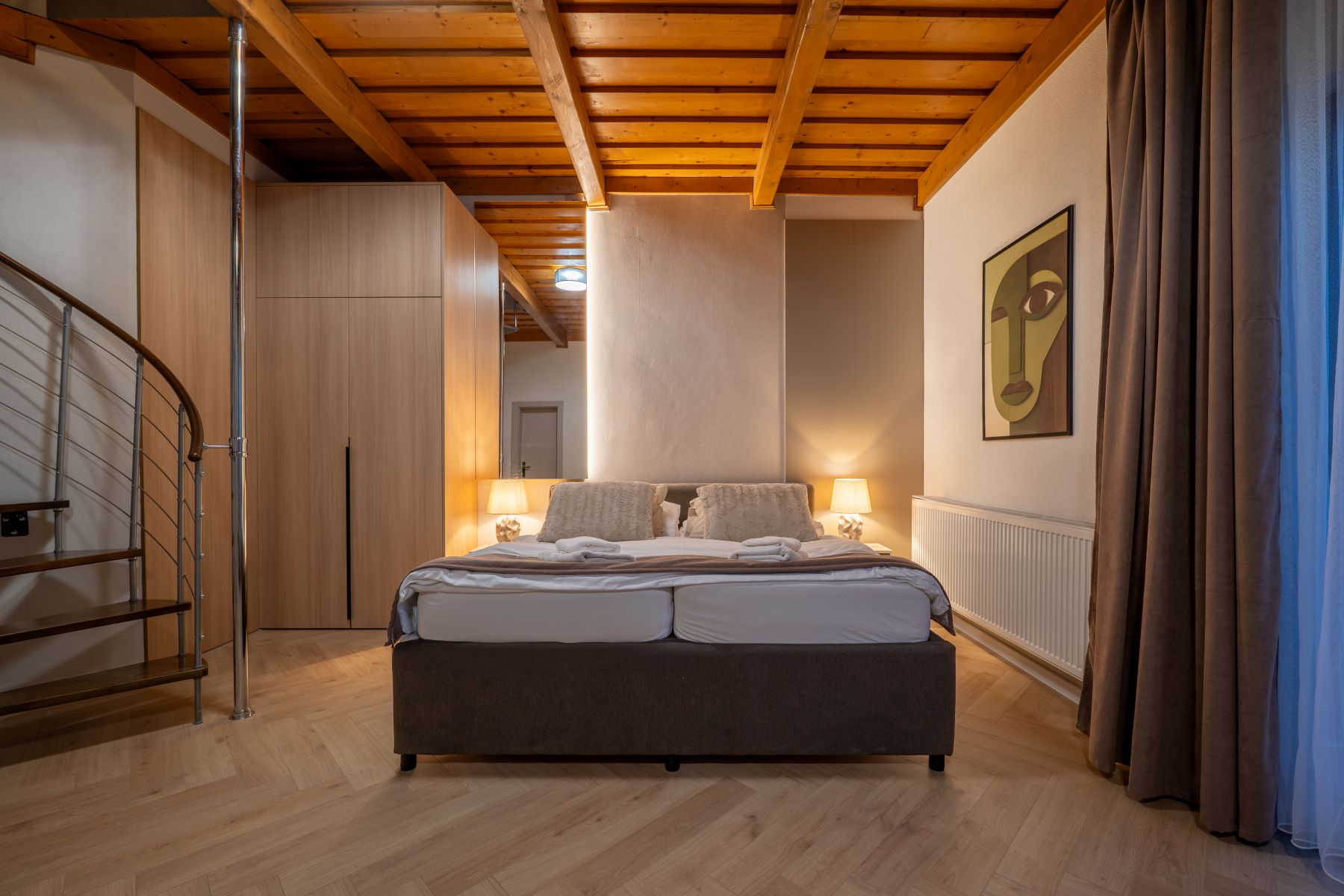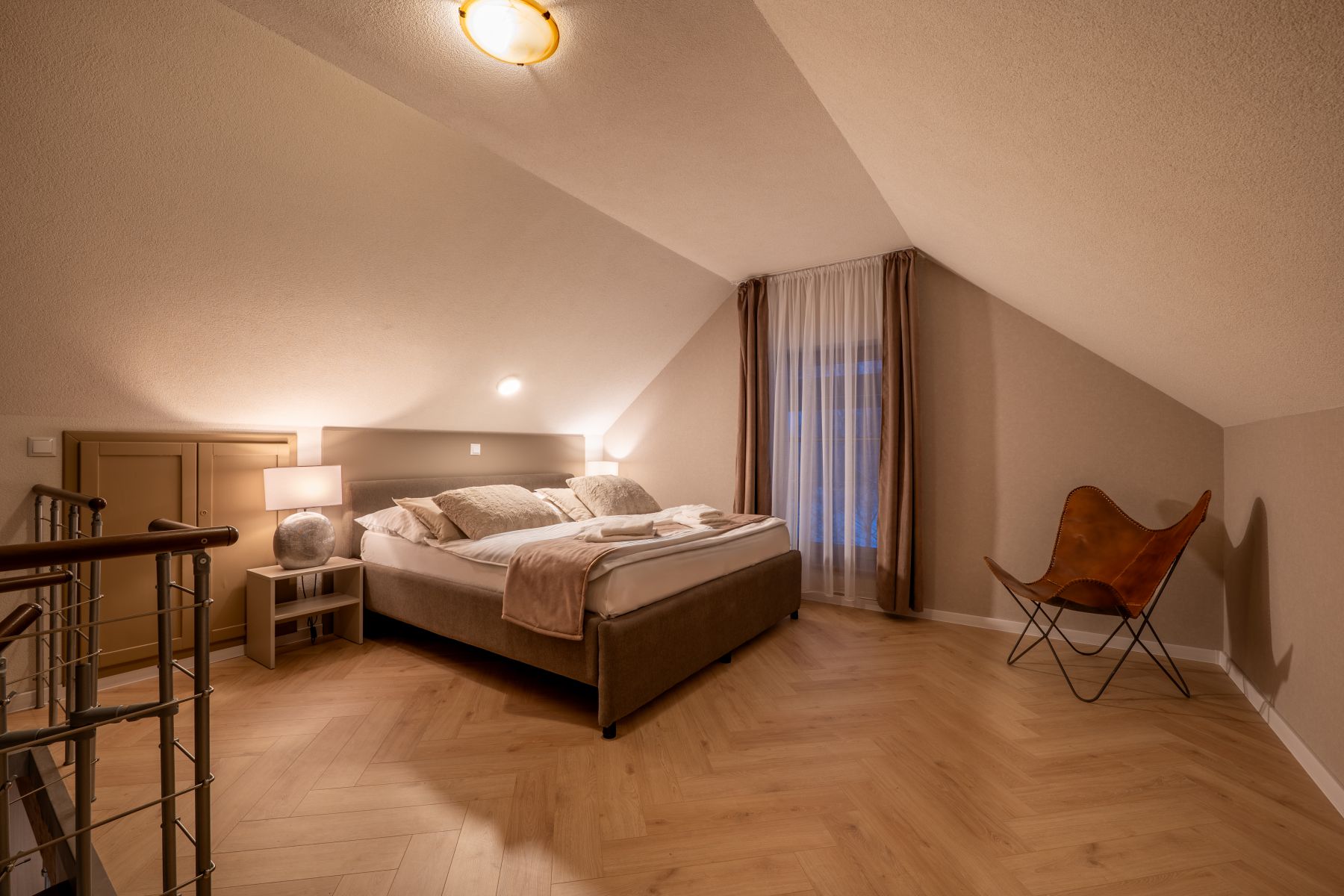 Na spodnom podlaží sa nachádza spálňa s manželskou posteľou a rozkladací gauč pre 2 osoby, s výstupom na balkón so sedením. Na poschodí, ktoré je riešené ako otvorený priestor, sa nachádza druhá manželská posteľ a dodatočné WC.