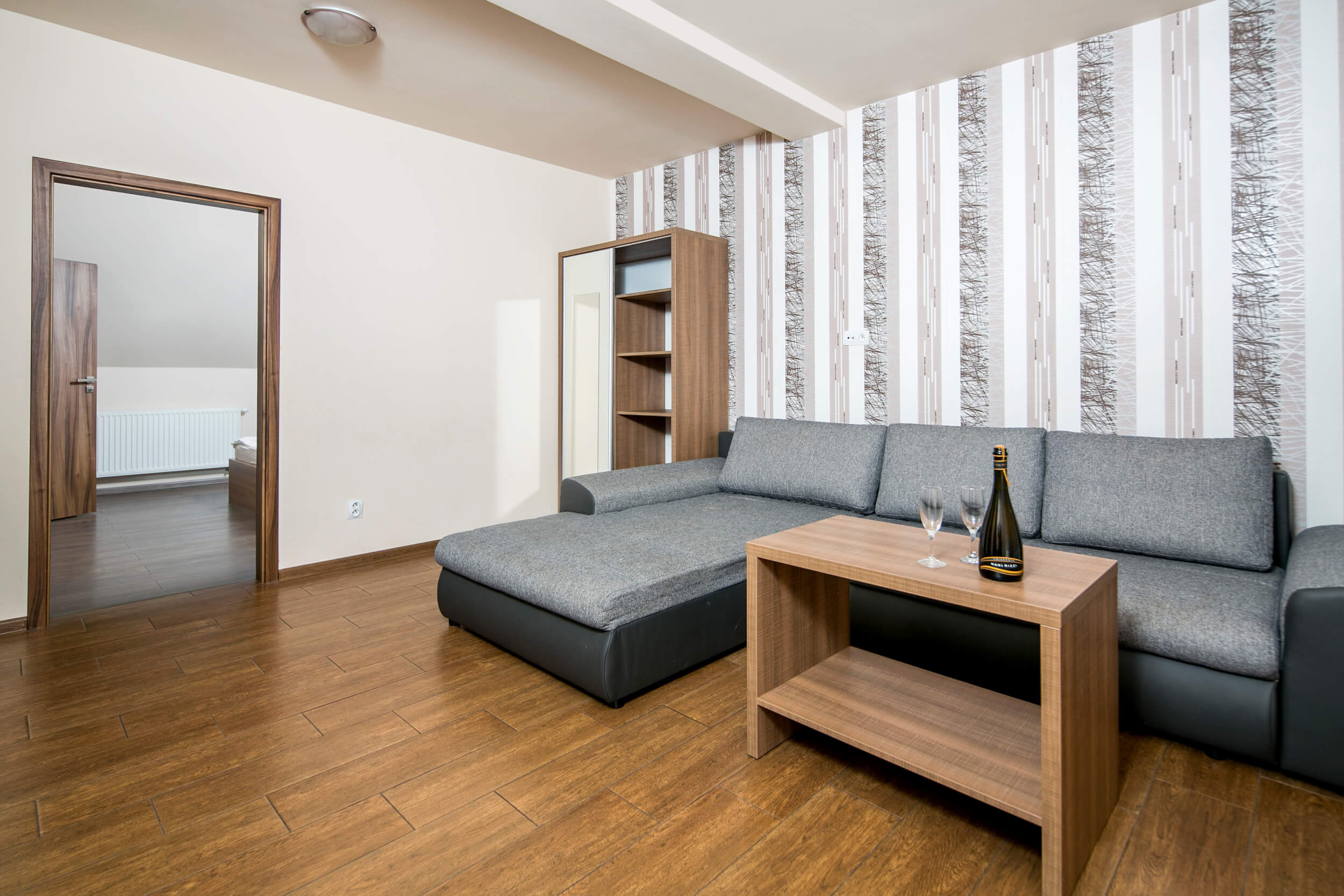 Komfortný rodinný apartmán s kuchyňou a jedálenským kútom, situovaný na poschodí s južnou orientáciou a výhľadom do záhrady. Apartmán disponuje samostatnou spálňou s manželskou posteľou a obývacou izbou prepojenou s kuchyňou, z ktorej je priamy výstup na terasu so sedením.
